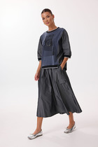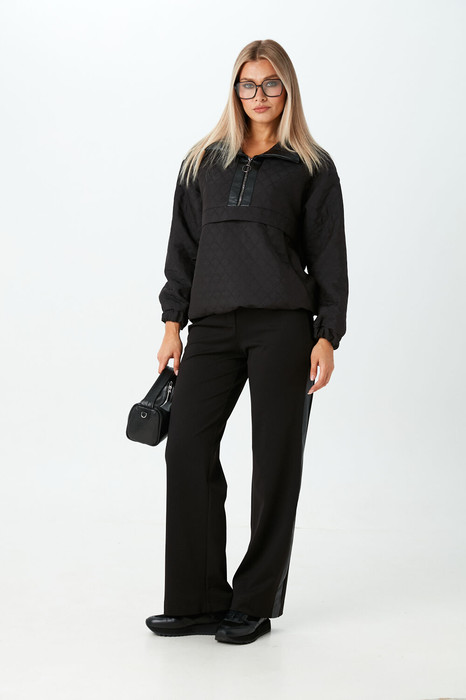 Комплект 2ка, состоящий из джемпера и брюк. Джемпер свободного объёма из стёганой ткани. Горловина на молнии с окантовкой из экокожи. Манжеты и низ джемпера на резинке. По бокам расположены карманы.Брюки прямого силуэта свободного объёма. Застёжка на молнию и пуговицу. Вдоль боковых швов расположены лампасы из экокожи. Пояс и задние накладные карманы также выполнены из экокожи.