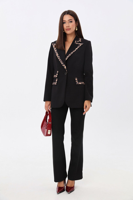 Костюм 2ка, состоящий из жакета и брюк.  Жакет однобортный умеренного объёма приталенного силуэта с застёжкой на пуговицу. По бокам расположены функциональные прорезные карманы с клапаном. Окантовка воротника и клапанов карманов выполнена из контрастной ткани с леопардовый принтом. Женские брюки малого объема, прямого силуэта. На передних половинках с обеих сторон расположены под наклоном нефункциональные прорезные карманы в рамку. На задних половинках расположены вытачки. Пояс отрезной. На поясе расположены шлевки. Застежка брюк – гульфик на молнии, на поясе крючок.  Рост фотомодели 175 см. Размер у фотомодели – 44.