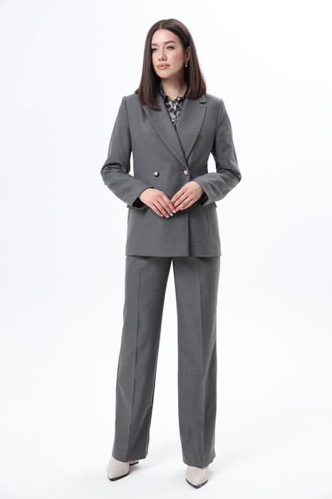 Костюм 2ка, состоящий из жакета и брюк. Жакет двубортный умеренного объёма приталенного силуэта с застёжкой на петли и пуговицы. По бокам расположены функциональные прорезные карманы с клапаном. Жакет на подкладке. Брюки умеренного объема, прямого силуэта. На передних половинках брюк заутюжены стрелки, переходящие в складки по линии талии. На задних половинках также заутюжены стрелки. По бокам расположены функциональные карманы. Застежка-гульфик. Пояс отрезной, притачной. На пояс настрочены шлевки. Пояс застегивается на петлю и крючок. Рост фотомодели 175 см. Размер у фотомодели – 44. СОВЕТ ОТ СТИЛИСТА: для прохладных дней надевайте под жакет водолазку , а из обуви можно подобрать кеды или ботинки на платформе. Для более романтичного образа советуем укомплектовать блузкой из нашей коллекции , а из обуви подобрать ботильоны на каблуке.