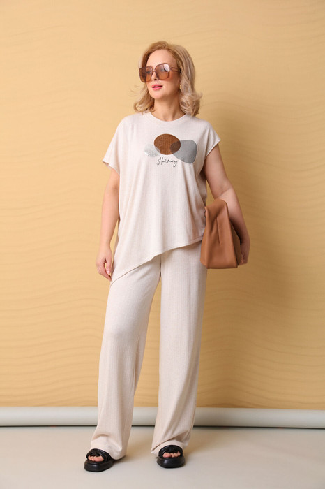 Костюм 2ка из лёгкой трикотажного полотна очень приятного к телу, состоящий из блузки и брюк. Свободная блузка с ассиметричной линией плеча.Плечо и низ блузки удлинёны по одной стороне. По переду оригинальная аппликация . Брюки сободные, прямого кроя. Рост модели 170, размер 48.
