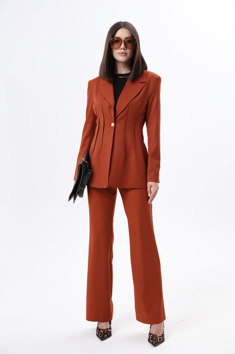 Костюм 2ка, состоящий из жакета и брюк. Жакет однобортный умеренного объема, приталенного силуэта. Силуэт изделия создается за счет отрезных бочков на спинке и полочке, а также за счет среднего шва и плечевых вытачек на спинке. На полочке нагрудная вытачка переведена в плечевой шов. Плечевой пояс расширен и поддерживается плечевыми накладками. Рукав втачной, длинный, двухшовный. Воротник отложной с отрезной стойкой, пиджачного типа. Застежка на уровне линии талии на одну петлю и пуговицу. Жакет полностью обработан притачной подкладкой. Длина изделия до середины бедер. Женские брюки малого объема, прямого силуэта. На передних половинках с обеих сторон расположены под наклоном нефункциональные прорезные карманы в рамку. На задних половинках расположены вытачки. Пояс отрезной. На поясе расположены шлевки. Застежка брюк – гульфик на молнии, на поясе крючок. Рост фотомодели 175 см. Размер у фотомодели – 44.                                                                                                                                СОВЕТ ОТ СТИЛИСТА:для добавления "остроты" образу советуем прием "total look" в одном цвете и носить костюм с блузкой ВИ 1631. А для стильного базового образа сочетайте с облегающей трикотажной майкой и не забудьте обязательно добавить украшения, например серьги и простое ожерелье. Из обуви могут быть лодочки на каблуке или лоферы на платформе. Не бойтесь обуви на плоском ходу-лекала брюк идеально удлиняют ноги.