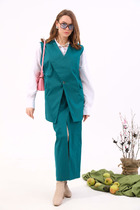 Комплект 2-ка, состоящий из блузки и брюк. Блузка свободного объёма, слегка зауженная к низу,с отложным воротником. Рукава 3/4. По переду застёжка планка на пуговицах.                                                                                                                                            Прямые брюки из мягкой экокожи с вискозной мягкой изнанкой, очень приятной к телу. По переду и сзади расположены карманы по принципу джинсовых брюк. Застёжка на молнию и пуговицу.        Рост модели 170, размер 48. СОВЕТ ОТ СТИЛИСТА: на работу из обуви отлично подойдут лоферы или босоножки с закрытым мысом на устойчивом каблуке средней высоты (в стиле Шанель).Для образа "выходного дня" сделайте выбор в пользу кроссовок или кед и возьмите объемную сумку.