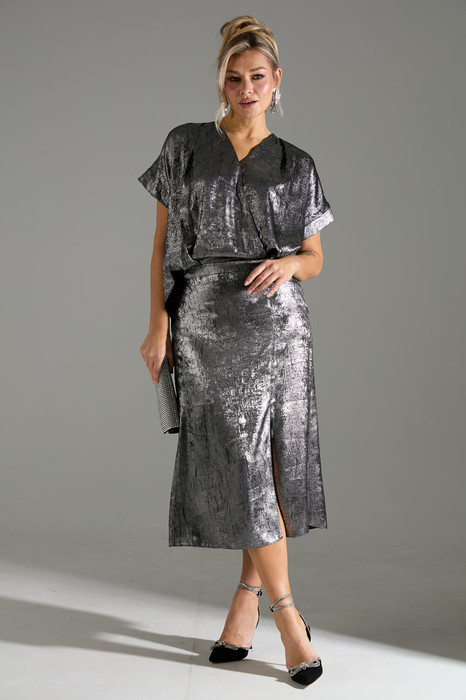 Комплект 2ка, состоящий из блузки и юбки. Блузка свободного силуэта с короткими рукавами. Горловина V-образная. Низ блузки разноуровневый: спереди короче, сзади длиннее. Блузка по талии может соединяться с юбкой с помощью молнии , создавая имитацию платья.