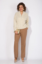 Комплект состоит из блузы и брюк. Блуза свободного кроя выполнена из легкой льняной ткани. Линия плеча спущена, рукав длинный, по низу рукава притачная манжета на застёжку петлю и пуговицу. Воротник рубашечного кроя, застёжка на петли и пуговицы. На правой половинке блузы расположен карман с вышивкой. По спинке кокетка. Брюки свободного кроя, прямые, выполнены из льняной ткани. По линии талии отрезной пояс на резинке и завязкой на шнурок. В боковых швах прорезные карманы.