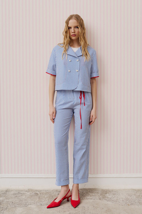 Костюм состоит из жакета и брюк. Жакет прямого силуэта, линия плеча спущена, рукав короткий, по низу рукава отложные манжеты с окантовкой в красном цвете. Округлый вырез горловины. Застежка глубокая, двубортная на петлю и пуговицу, низ борта округлой формы. Брюки на притачном поясе, по переду складки, застежка на молнию. В боковых швах прорезные карманы, по низу брюк отложная манжета.