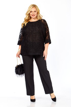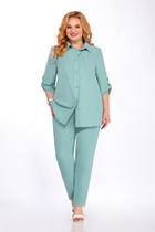 Блуза выполнена из хлопка свободного кроя. Рукав втачной длинный, по переднему шву рукава застежка на петли и пуговицы, по низу рукава манжета. По горловине воротник рубашечного типа на стойке. По переду планка с застежкой на петли и пуговицы. Брюки из нежной вискозной ткани свободного кроя, прямого силуэта, по талии на резинке, в боковых швах карманы.