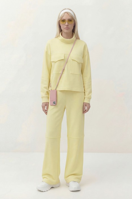 Комплект спортивный. Состоит из свитшота и брюк. Свитшот прямого, свободного силуэта, ниже линии талии. Рукав втачной длинный. Воротник- стойка. По переду выполнены декоративные накладные карманы с клапанами.
