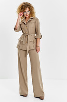 Брюки прямого силуэта расширенные книзу из костюмной ткани. По верху притачной пояс с застежкой на петлю и пуговицу и шлевками для ремня. На передних половинках обработаны карманы и застежка молния в среднем шве. На задних половинках кокетка и накладные карманы. На кармане дизайнерская вышивка. По поясу задних половинок брюк резинка. Обращаем ваше внимание, что фурнитура может отличаться от фото.