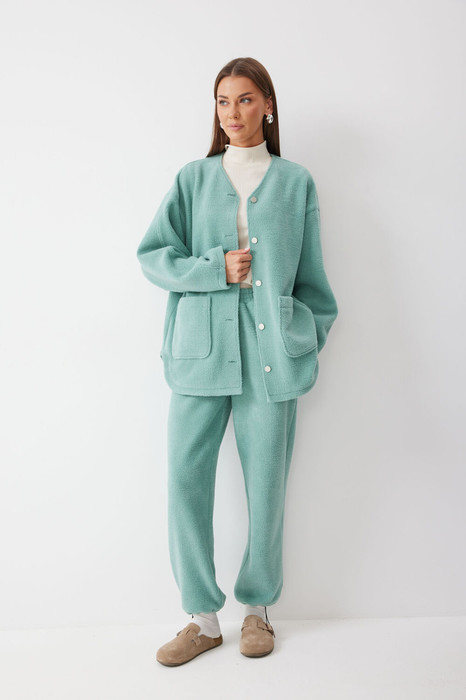 Костюм, состоящий из жакета и брюк. Жакет прямого силуэта с фигурным низом из трикотажного полотна. Горловина округлая, по центру застежка на кнопки. Рукав со спущенной линией плеча. По переду накладные карманы. Жакет без подкладки. Обращаем ваше внимание, что фурнитура может отличаться от фото.