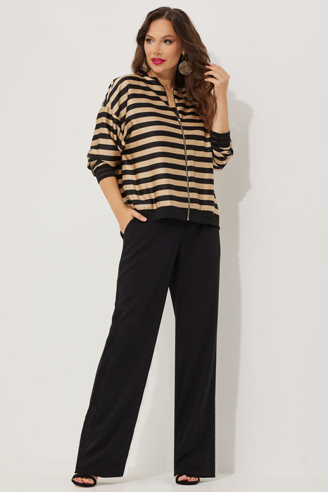 Стильный комплект из шикарного бомбера и брюк. Бомбер свободного кроя с центральной застежкой на металлическую молнию. Выполнен из шелковистой поливискозной ткани. Бомбер дополнен комфортной подкладкой. Горловина, низ переда и  манжеты рукава  выполнены из трикотажного, полупрозрачного довяза. Брюки классического прямого кроя с притачным поясом, дополненным эластичной тесьмой. Брюки с  удобными боковыми карманами.  Застежка гульфик на молнию и пришивную пуговицу. Длина бомбера от плечевого шва по переду 94см., по спинке 69см. Длина рукава 91 см. Длина брюк по боковому шву 109см.