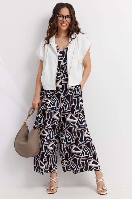 Стильный летний комплект из комбинезона и жилета. Легкий комбинезон свободного силуэта длиной 7/8, без рукавов, с V-образным вырезом горловины. Выполнен из штапеля. Дополнен удобными боковыми карманами. Притален съемным поясом, выполненным из основной ткани. Застежка комбинезона на молнию в среднем шве спинки. Жилет в спортивном стиле свободного кроя с центральной застежкой на металлическую молнию. Выполнен из хлопкового джинса. Горловина обработана капюшоном, дополненным шнурком. Для придания объема по низу жилета расположена скрытая кулиска с фиксаторами. Для удобства жилет дополнен удобными карманами.