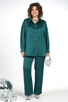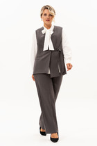 Стильный комплект из жакета и брюк. Жакет двубортный прямого кроя, на подкладке, слегка укорочен. Классический воротник и застежка на пуговицы создают стильный и универсальный силуэт, который легко комбинируется как с брюками прямого кроя , так и с юбкой. Рукав втачной. Жакет дополнен отделкой из рогожки бирюзового цвета, что придает образу уникальность. Брюки прямого кроя с притачным поясом, дополненным эластичной тесьмой. Посадка средняя. Застежка гульфик на молнию и пуговицу. Дополнены функциональными боковыми карманами. Длина жакета от плечевого шва 57см. Длина рукава 60см. Длина брюк по боковому шву 104см.