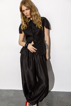 Стильный комплект из рубашки и брюк, выполненных из натуральной фактурной ткани. Рубашка свободного прямого кроя с центральной застежкой на металлические кнопки. Горловина обработана отложным воротником. Рукав цельнокроеный. Брюки прямого свободного кроя с притачным поясом, дополненным эластичной тесьмой. Посадка средняя. Дополнены удобными боковыми карманами. Длина рубашки от плечевого шва 70 см. Длина брюк по боковому шву 107см.