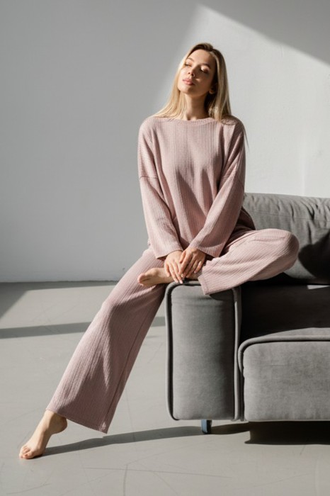 Костюм молодежный из гладкокрашеного фактурного трикотажного полотна, состоящий из джемпера и брюк. Джемпер – прямого силуэта, свободная, с цельнокроеными длинными рукавами , горловиной овальной формы, обработанной втачной планкой.Брюки – свободного кроя, длинные, с эластичной тесьмой по талии и шнурком, продетым в две обметанные петли.