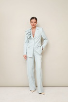 Универсальный и удобный женский брючный костюм для повседневной носки из мягкого материала - льна-вишера. Жакет свободный укороченный с цельнокроенным рукавом длиной до локтя, по низу с отворачивающимся манжетом. Перед жакета с ассиметричной косой застежкой на навесные петли с пуговицами. Брюки-шаровары длиной 7/8,  по верху с поясом на резинке. Имеются боковые карманы в швах. Также по талии (переда) двухвстречные складки, по низу передних и задних половинок односторонние складки, придающие пышность брюкам. Комплект смело сочетается с любой обувью. Длина жакета по спинке 57 см, длина рукава от горловины 33 см. Длина брюк по боковому шву 95 см, по шаговому 64 см. Изделие подойдет на рост 170 см.