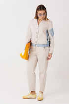Комплект женский брючный повседневный. Женская хлопковая блуза в стиле «бохо» свободного кроя, вырез горловины круглый с раскладным асимметричным воротником, по спинке скрепленным патой, а по переду с декоративным «галстуком». Рукав втачной 3/4, низ блузы так же с асимметрией и боковыми разрезами. Перед цельный, спинка разрезная с плечевой кокеткой, переходящей в рукав. Левый рукав  — с кулиской и декоративной стяжкой. Так же по переду круглый декоративный карман-стяжка. Брюки выполнены из хлопковой ткани средней плотности, длина 7/8, слегка заужены к низу, по верху на притачном поясе с резинкой по бокам. По переду с двумя боковыми карманами в швах и центральной застежкой на молнию и пуговицу. Универсальность кроя и легкая ткань сделают его любимым изделием Вашего гардероба. Длина блузы по спинке 74 (+/- 1 см), длина рукава от горловины 55 (+/- 1 см). Длина брюк по боковому шву 100 см (±1 см), длина брюк по шаговому шву 72 +-1 см. Изделие подойдет на рост 170 см.