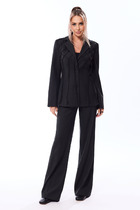 Костюм-тройка - это стильный и элегантный вариант женского делового костюма, состоящего из жилета, брюк и топа. Этот классический ансамбль придает образу серьезность и профессионализм, сохраняя при этом женственность и изысканность обладательницы. Костюм женский, брючный, выполнен из струящейся легкой вискозной ткани, состоит из распашного удлиненного жилета, свободных прямых длинных брюк и однотонного топа. Жилет прямого силуэта со съемным поясом с застежкой на полукольца, с пиджачным воротником с лацканами. Перед распашной с бортами встык, с двумя прорезными карманами с листочками. Спинка цельная. Плечо спущенное, по плечевым швам вставки из декоративной сетки. Брюки прямые, расширенные к низу, длинные, по низу с широкой подгибкой, по верху - на притачном поясе с резинкой. Топ без рукавов с квадратной горловиной по переду и рельефами. Спинка с центральным швом. Пройма и горловина спинки окантованы. Длина жакета по спинке73 см(+-1 см), длина рукава 27 см(+-1см), длина брюк по боковому шву 112 см(+-1 см),  длина брюк по шаговому шву 82 см(+-1 см). Длина топа по спинке 55 см(+-1см)