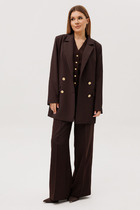 Комплект двухпредметный состоит из жакета и брюк. Жакет на подкладке с центральной застежкой на 2 петли и пуговицы с воротником пиджачного типа. По переду функциональными карманами с клапаном. Спинка с рельефом выходящим из проймы и средним швом. Рукав втачной с декоративным швом по середине рукава переходящим в шлицу. Шлица декорирована 5-ю пуговицами. Брюки прямые от бедра с боковыми карманами. Пояс на резинке по спинке. Костюм двойка отлично подойдет для офиса, для праздника, на каждый день для прогулок.