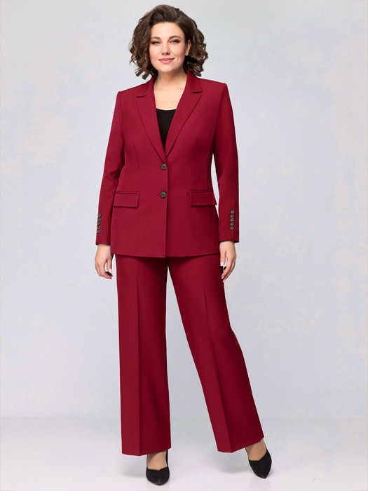Комплект двухпредметный состоит из жакета и брюк. Жакет на подкладке с центральной застежкой на 2 петли и пуговицы с воротником пиджачного типа. По переду функциональными карманами с клапаном. Спинка с рельефом выходящим из проймы и средним швом. Рукав втачной с декоративным швом по середине рукава переходящим в шлицу. Шлица декорирована 5-ю пуговицами. Брюки прямые от бедра с боковыми карманами. Пояс на резинке по спинке. Костюм двойка отлично подойдет для офиса, для праздника, на каждый день для прогулок.