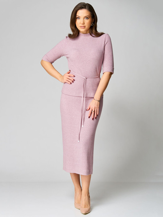 Комплект женский 2-х предметный состоит из туники и юбки из трикотажного полотна в рубчик. Туника прямого силуэта, воротник-стойка, рукав втачной, одношовный с отложной манжетой по низу. Юбка прямого силуэта с разрезом сзади,  на трикотажной  подкладке. По верхнему срезу притачной пояс с резинкой. В комплекте  имеется пояс съемный пояс.