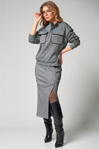 Комплект женский2-ух предметный, состоящий из блузки и юбки. Блузка прямого силуэта с фигурным низом из двух разных фактур тканей. Воротник отложной на стойке. По переду нагрудные вытачки и потайная застёжка на петли пуговицы перходящаа в складку. По правой верхнй части переда пришивное украшение . Рукав втачной длинный со сборкой по низу, на манжете. Манжет с застёжкой на петлю и одну пуговицу. Юбка прямого силуэта, на подкладке с притачным поясом, по бокам резинка. Застёжка по спинке на молнию, в среднем шве юбки разрез. Длина блузки 61см, длина рукава 59см, длина юбки 71см.
