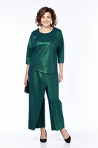 Комплект, состоящий из жакета и юбки. Жакет полуприлегающего силуэта выполнен из трикотажного полотна . По переду жакета настрочены карманы обманки с листочкой с декоративной тесьмой и пуговицей. Так же декоративная тесьма по горловине переда. Рукав втачной двухшовный. Спинка со средним швом и талиевыми вытачками. Застегивается жакет на 4 пуговицы и петли. Жакет без подкладки. Длина рукава- 20,5 см, длина по спинке-53 см.Юбка на широкой обтачке А- силуэта, на подкладке из плащевой ткани. По переднему и заднему полотнищу заложены складки. По бокам расположены наклонные карманы. Застежка сзади на потайную тесьму-молнию. Длина юбки по боковому шву- 83см.