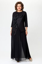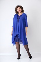 Блузка полуприлегающего силуэта выполнена из шифона «травки». Округлый вырез горловины. По переду настрочен нагрудный карман обманка листочка с 1 пуговицей. Спинка со средним швом и талевыми вытачками. Рукав втачной, одношовный на притачной манжете, застежка на 1 пуговицу и петлю . Застежка центральная 5 пуговиц и петель. Юбка с завышенной талией заужена к низу на обтачке выполнена. По переднему полотнищу юбки настрочена карман «листочка». Сзади разрез и застежка на потайную тесьму-молнию. Юбка на подкладке.