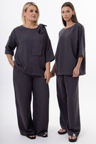 Костюм женский, состоит из блузы и брюк. Рукав у блузы - реглан, со сбокой по окату. Рукав расширенный до линии локтя. По переду и спинке блузы - притачная планка с резинкой. Низ блузы с притачным поясом и резинкой. Брюки на резинке, свободные, прямые, с карманами в боковых швах.