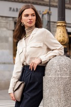 Костюм женский, состоящий из блузы и брюк. Блуза прямого силуэта, с разрезами по бокам. Ассиметричный низ: спинка длиннее переда. Рукав цельнокроеный,  заканчивается притачной манжетой. Горловина V-образная с притачной планкой по линии переда, спинки и рукава. Головина на завязке. Дополнением служит пояс. Брюки по силуэту с легким клешем от колена, по передним половинкам по центру застрочен защип. Карманы боковые накладные. Брюки с застежкой на молнию. Притачной пояс застегивается на петлю-пуговицу и с резинками по бокам. Модель без подкладки.