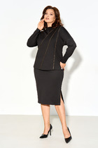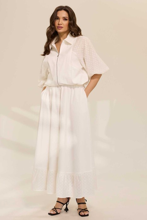 Костюм женский состоит из блузы и юбки макси на подкладке. Блуза свободного силуэта, с возможностью затянуть низ изделия. По переду застежка на молнию. Воротник стоячий-отложной. рукав цельнокроный с вертикальными рельефами по переду и на спинке. По переду - карманы. Юбка расклешенная к низу, талия на притачном поясе на резинке. По низу юбки пристрочен волан. Юбка с карманами в боковых швах.