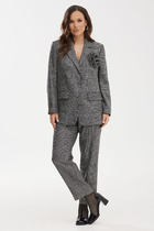 Костюм женский, состоящий из блузы и брюк. Блуза прямого силуэта, с разрезами по бокам. Рукав цельнокроеный, заканчивается притачной манжетой. Горловина V-образная с притачной планкой по линии переда, спинки и рукава. Головина на завязке. Дополнением служит пояс. Брюки по силуэту с легким клешем от колена, по передним половинкам по центру застрочен защип. Карманы боковые накладные. Брюки с застежкой на молнию. Притачной пояс застегивается на петлю-пуговицу и с резинками по бокам. Модель без подкладки.