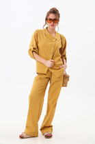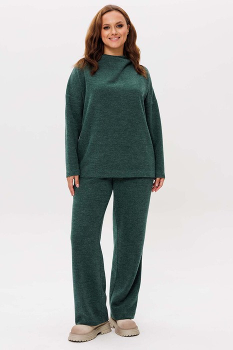 Костюм трикотажный женский состоит из джемпера и юбки нан подкладке. Джемпер прямого силуэта со спущенным втачным рукавом. В боковых швах обработаны разрезы. Горловина - цельнокроенная стойка. Юбка миди. Зауженная к низу. Спинка со средним швом, заканчивающимся разрезом. Талия обработана притачным поясом на резинке.