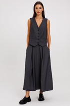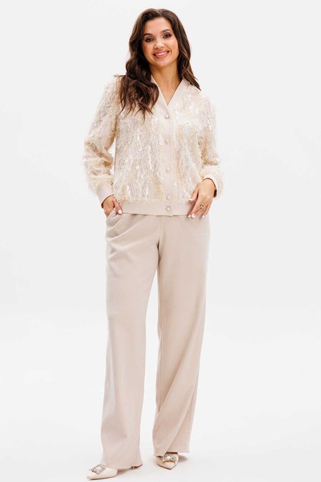 Костюм женский, состоящий из жакета на трикотажной подкладки и брюк палаццо. Жакет с притачной планкой по борту, с центральной застежкой на петли-пуговицы. Плечо спущенное, рукав втачной, с манжетой. Полочки и рукава из отделочной ткани. Брюки палаццо, на притачном поясе с резинкой и тесьмой. У брюк - боковые карманы.