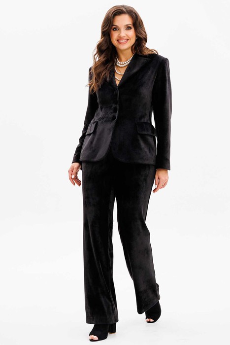 Костюм брючный, состоит из жакета и брюк. Жакет полуприлегающего силуэта, на подкладке, с центральной бортовой застежкой на 2 петли и пуговицы. Воротник отложной, на стойке. Рукав втачной, двухшовный со шлицей по низу и обработан 4-мя декоративными пуговицами. Карманы прорезные с клапаном. Спинка со средним швом. Брюки зауженные к колену, расклешенные к низу. Пояс притачной, застежка на молнию. Брюки с боковыми карманами.