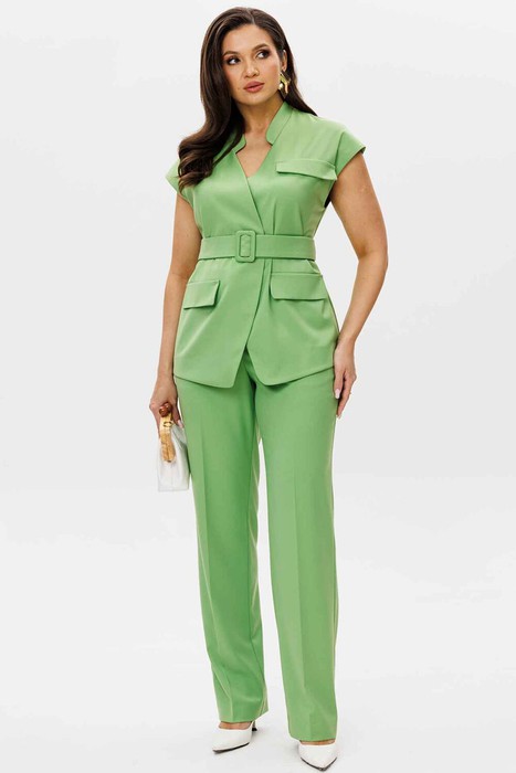Костюм женский, состоящий из жилета и брюк. Жилет полуприлегающего силуэта, без подкладки. Плечо спущенное.Вырез V - образный, с воротником стойкой. по переду иммитация карманов с клапаном. Центральная застежка на пришивные кнопки. Спинка со средним швом и вытачками. Брюки прямого силуэта, слегка зауженные к низу. Пояс частично на резинке (по бокам), с шлевками для ремня. Застежка на гульфик с молнией и внутренним крючком. По бокам боковые карманы с косым входом, сзади декоративные прорезные карманы «в рамку». Материал костюма костюмный, средней плотности, с гладкой фактурой. Без подкладки. Дополняет модель широкий пояс.