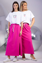 Костюм женский, состоящий из блузы и юбки. Блуза свободного кроя. Перед с нагрудными вытачками. Рукава втачные, одношовные. По боковым швам обработаны разрезы. Юбка прямого силуэта, с рельефами по переду, заканчивающимися шлицами. По бокам переда обработаны карманы. Спинка со ср. швом и застежкой на тесьму-молнию. По бокам юбки настрочена отделочная тесьма. Юбка на подкладке. Верх обработан притачным поясом.