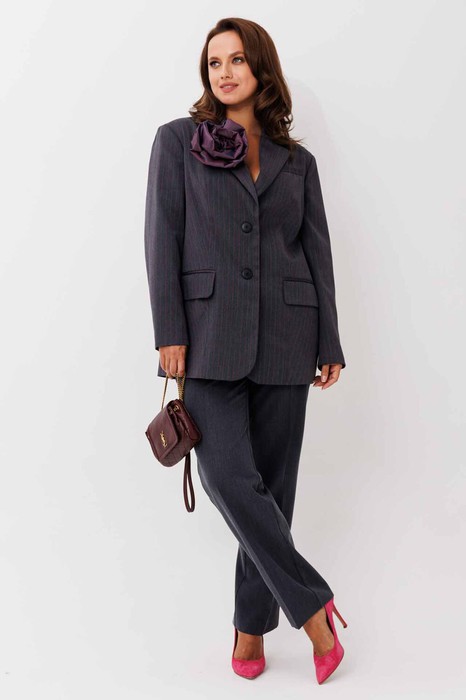 Костюм женский, состоит из жакета и брюк. Жакет полуприлегающего силуэта удлинённый, с центральной застёжкой на две прорезные петли и пуговицы. Перёд жакета с талевыми вытачками и прорезными карманами с клапанами. Лацканы классической формы. Спинка со средним швом и шлицей с разрезом. Рукава втачные двух шовные, по низу декоративная отделка. Жакет на подкладке. Брюки женские с высокой посадкой, прямые, на притачном поясе, по спинке по бокам продета эластичная тесьма - резинка. По переду застёжка молния с гульфиком и откоском. Брюки с боковыми карманами . На задних половинках брюк имитация прорезных карманов с листочкой. Дополняет модель декоративный цветок-брошь.