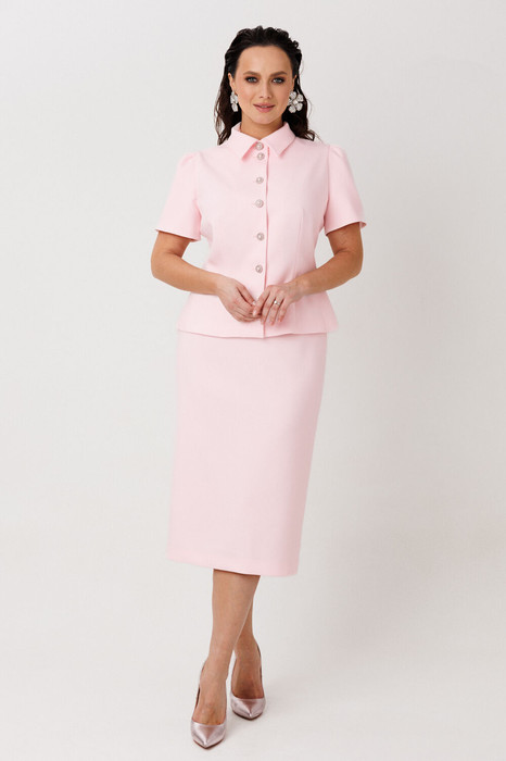 Элегантный женский костюм классического кроя. Комплект состоит из жакета и юбки-карандаш. Жакет полуприлегающего силуэта, спинка со средним швом. По конструкции предусмотрена центральная застежка на 8 пугович. воротник стоячий отложной. Рукава втачные, со сборкой по окату. Юбка длиной миди, слегка зауженная к низу со шлицей. Пояс юбки на обтачке, застежка на тесьму-молнию, пояс частично на резинке по бокам. Жакет и юбка на подкладке.