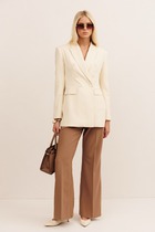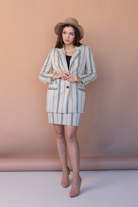 Жакет полуприлегающего силуэта удлинённый, с центральной застёжкой на две прорезные петли и пуговицы, выполнен из трикотажного полотна.  Перёд жакета с талевыми вытачками и прорезными карманами и клапанами. Лацканы классической формы. Спинка со средним швом. Перед и спинка с рельефами от проймы до низа изделия. Рукава втачные двух шовные. Жакет на подкладке.