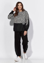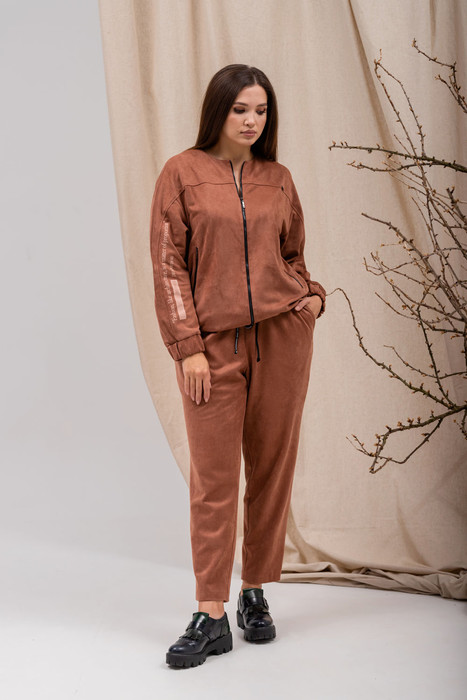 Костюм женский свободного силуэта состоит из джемпера и брюк.  Перёд джемпера застёгивается на металлическую молнию. Цельнокроеные рукава реглан с подрезами переходят в кокетки переда и спинки. Прорезные карманы переда застёгивается на металлическую молнию. Горловина круглая. Низ джемпера и низ рукавов на резинке.