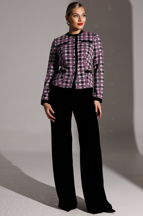Брючный костюм в стиле Шанель представляет собой элегантное сочетание классики и современности. Жакет выполнен из трикотажного полотна с актуальным принтом «гусиная лапка», имеет полуприлегающий силуэт и центральную застежку на пуговицы. Спинка оформлена средним швом и талиевыми вытачками, что обеспечивает идеальную посадку. Передняя часть также украшена талиевыми вытачками, а округлая горловина подчеркивает женственность образа. Функциональные карманы с листочками расположены внизу, в то время как имитация карманов в верхней части переда добавляет изюминку. Листочки на карманах и планка горловины выполнены из бархата с отделкой по краям, создавая контраст текстур. Рукава втачные, двухшовные, с планкой по низу, также отделанной бархатом. Жакет на подкладке, что обеспечивает комфорт при носке. Брюки палаццо из бархата имеют стильные широкие штанины и удобную резинку на поясе, что делает этот костюм идеальным выбором как для деловых встреч, так и для вечерних выходов.
