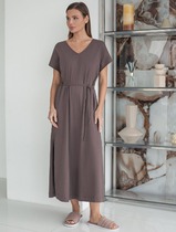 Платье свободное с V-вырезом из 100% хлопка с поясом и разрезом