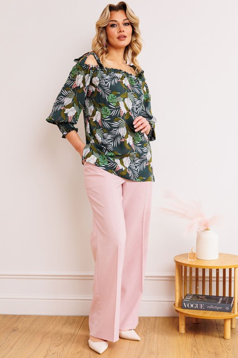 Комплект женский, состоящий из блузы и брюк. Блуза удлиненная, в боковых швах с разрезами. По верхнему краю блузы кулиска с резинкой. Рукав расширенный, на широкой манжете. Для удобства в носке мы дополнили блузу