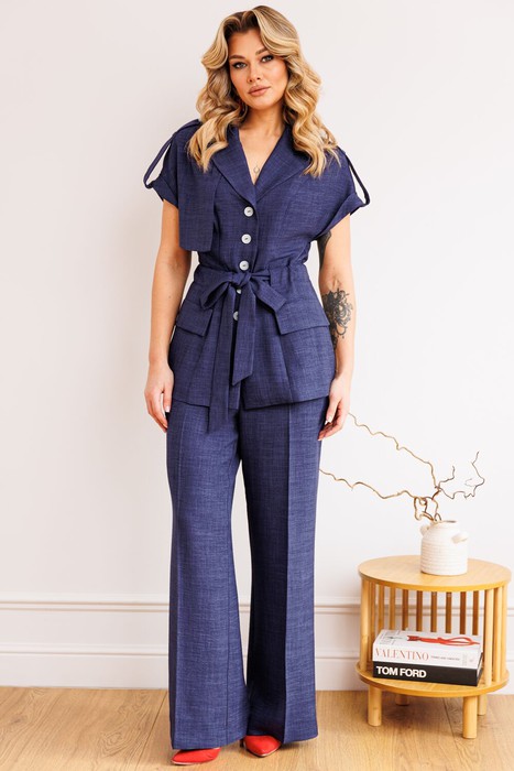 Стилисты бренда Мода-Юрс собрали для Вас комфортный лук, который состоит из жакета с цельнокройным рукавом и брюк "палаццо". Жакет полуприлегающего силуэта с кулиской, что позволит Вам подчеркнуть линию талии. Линия плеча спущена, низ рукава с притачной манжетой и патой, которая застегивается на петлю и пуговицу. Спинка со средним швом. Воротник пиджачного типа. Застежка центральная, на петли-пуговицы. Брюки на притачном поясе с резинкой. Застежка на тесьму-молнию.