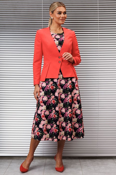 Двухпредметный костюм от бренда Мода-Юрс состоит из жакета и платья. Жакет полуприлегающего силуэта, отрезной по линии талии, спереди со шлицами. Спинка с талиевыми вытачками и средним швом. Рукав втачной, двухшовный. Застежка центральная на петли-пуговицы. Жакет на подкладке. Платье полуприлегающего силуэта, отрезное по линии талии. Верхняя часть платья по переду с рельефами. Нижняя часть платья А-силуэта. Спинка со средним швом и талиевыми вытачками. Застежка на тесьму-молнию в среднем шве. Рукав втачной, одношовный. Платье дополнено поясом, что позволяет регулировать ширину по линии талии.