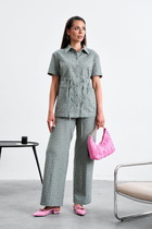 Туника полуприлегающего силуэта . Спинка со средним швом и талиевыми вытачками. По переду выполнены нагрудные вытачки, которые выходят из боковых швов. Низ туники ассиметричной формы. Вырез горловины округлой формы. Брюки прямые, слегка зауженные к колену. На притачном поясе сзади с резинкой. Брюки с карманами. Застежка на тесьму молнию. Костюм декорирован съемной брошью.