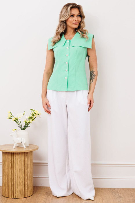 Яркий комплект: жилет с воротником "апаш" и брюки "палаццо". Этот смелый и элегантный комплект сочетаем в себе дерзость и женственность, создавая образ, который невозможно игнорировать. Жилет приталенного силуэта с центральной застежкой на петли пуговицы. Вертикальные рельефы. Главная акцентная деталь - шикроий воротник "апаш". Спинка с центральным швом и рельефами. Брюки "палаццо" создают воздушный силуэт. Высокая талия визуально удлиняем ноги. Брюки на притачном поясе, с двумя складками по переду. Боковые карманы. Сзади резинка. Молния в среднем шве. Жилет на подкладке.