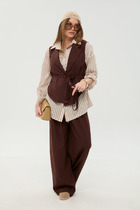 Брюки прямого, свободного кроя с высокой посадкой, с наклонными карманами в боковых швах, по срезу банта – застежка-молния. По передним половинкам талиевые вытачки. По низу брюк отрезные манжеты.