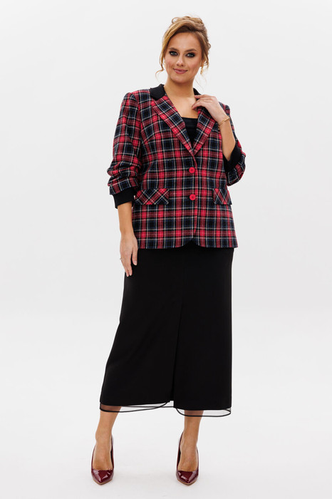 Жакет полуприлегающего силуэта, выполнен из костюмной ткани (не тянется) с отделкой из довяза на подкладке. Перед с нагрудными вытачками и настрочными клапанами. Застежка центральная на петли-пуговицы. Горловина оформлена воротником пиджачного типа с лацканом. Спинка со средним швом. Рукава втачные, двухшовные с мягкими складками и манжетой из довяза.