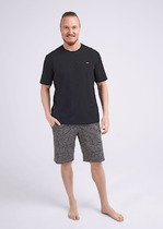 Костюм мужской, состоящий из футболки и брюк. Футболка однотонная с принтом на груди; модель свободная, со спущенной линией плеч, овальным вырезом горловины. Брюки из полотна с набивным рисунком эксклюзивного дизайна, прямые, с боковыми карманами с обтачными входами, на притачном поясе с отстроченной эластичной тесьмой.